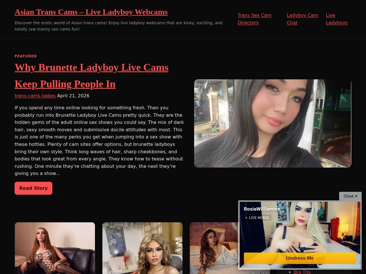 If you’re looking for real Asian ladyboy cams, you’ve come to the right spot. Asian Trans Cams brings you live ladyboy webcams from Thailand, Philippines, Vietnam, and other parts of Asia. These are real hotties broadcasting right now from home. With no fake porn clips, just actual live shows. The site is simple to use. You can jump straight into free public chats or go private for one-on-one time. Most of the models are young, smooth, and very open about what they like. Some are slim and feminine, others more muscular with that classic ladyboy look. You’ll find everything from teasing and chatting to full hardcore action, depending on the model and your mood. Live ladyboy webcams here run 24/7. Peak hours are usually evenings in Asia, but there are always girls online no matter what time it is where you are. The streams are clear, the chat works well, and tipping is straightforward if you want to see something specific. Whether you’re new to ladyboy cams or you’ve been watching for years, Asian Trans Cams makes it easy to find what turns you on. You can browse by country, body type, or just scroll through the live thumbnails until something catches your eye. No complicated sign-up needed to start watching. Just click, watch, and enjoy the show.